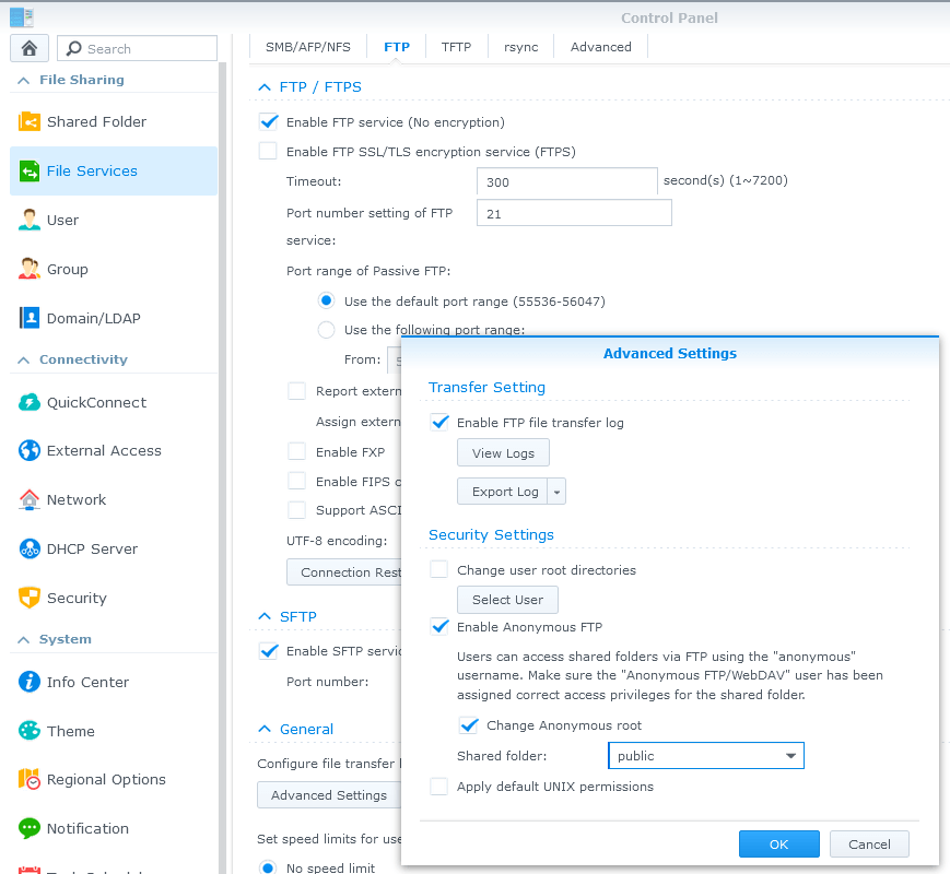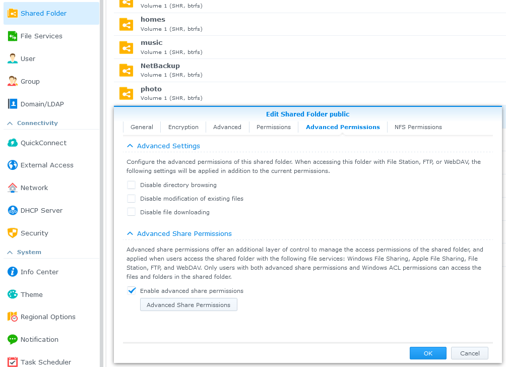 The first step is disable advanced permissions on whichever directory you want to use for Anonymous FTP. In my case, the share was called ‘public’: