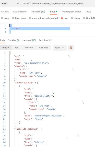 To get full details for a specific object, we have to specify the name or uuid in the POST body. For example, to get more information about a specific VPN community, make a request to /web_api/show-vpn-community-star with this: